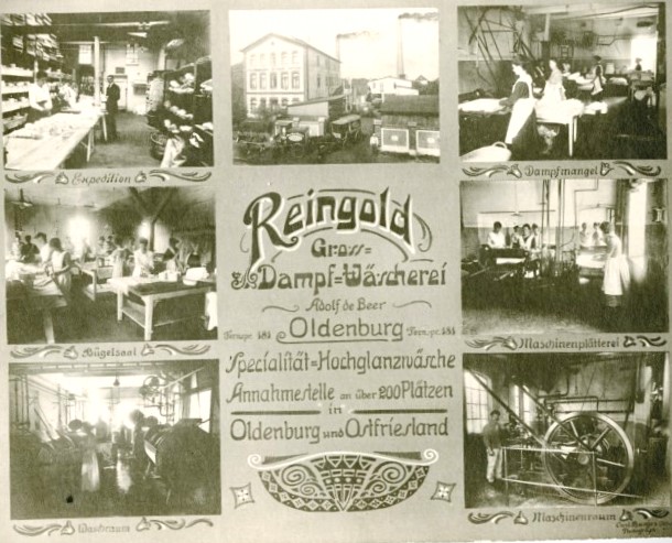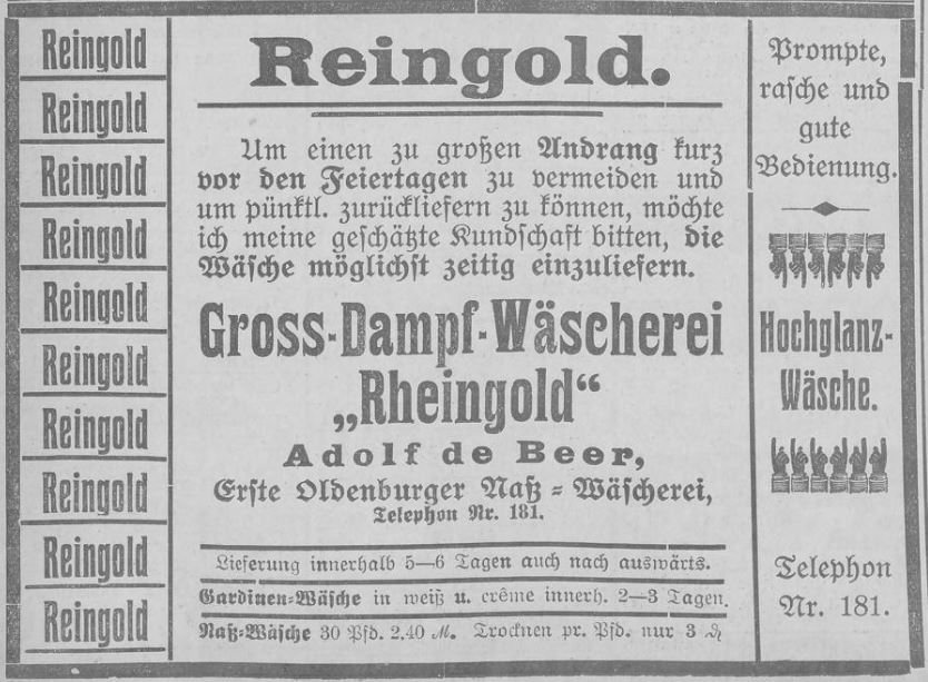 Zunächst mietete Adolf ein Grundstück der ehemaligen Wurstfabrik am Hochheider Weg 3, das später in seinen Besitz überging. Er baute die Wäscherei schnell aus und stattete sie mit modernen, elektrischen Maschinen aus, um seinen Kunden maximalen Komfort zu bieten. Die Dampflauerei „Reingold” war bald mit Aufträgen überlastet und eröffnete mehrere Filialen und Wäscheausgabestellen in Ostfriesland, also außerhalb der Region Oldenburg. Zu den Kunden zählten vor allem Hotels, Restaurants und Kasinos, aber auch private Haushalte. Die Popularität der Dampfwäscherei stieg in sehr kurzer Zeit so stark an, dass Adolf de Beer in der Weihnachtszeit 1908 eine Anzeige in der Zeitung Stadt- und Dorfnachrichten schaltete, um die Aufregung zu dämpfen.