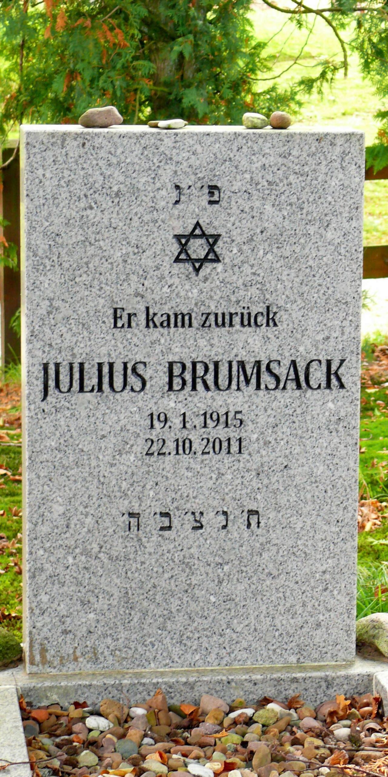 Grabstein von Julius Brumsack. Inschrift: „Er kam zurück“. Quelle: Privatarchiv Fam. Brumsack