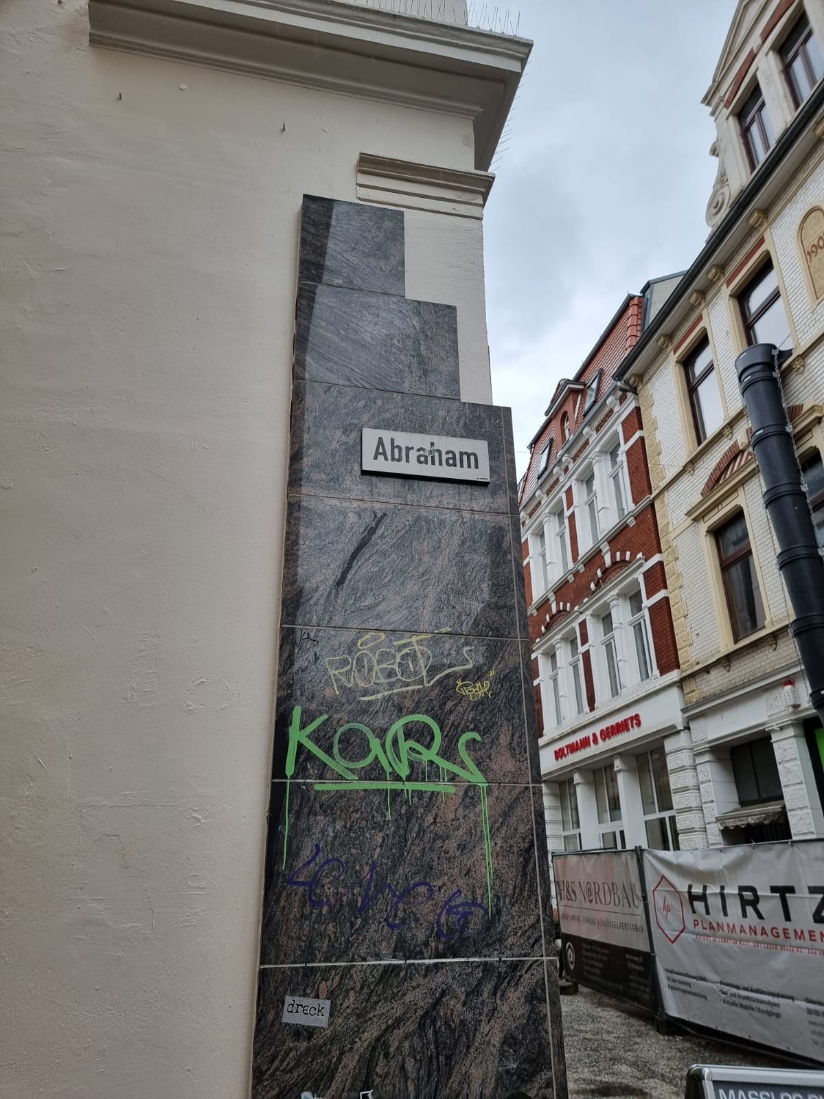 Bis vor kurzem befand sich die Informationstafel noch an ihrem Platz an der Ecke Gaststraße/Abraham-Gasse. Als unser Fotokorrespondent vor Ort war, um neue Fotos zu machen, stellte er fest, dass die Tafel fehlte und die Verkleidungsplatten mit Graffiti beschmiert waren. Zu diesem Zeitpunkt wurde der Artikel bereits zur Veröffentlichung vorbereitet. Dies löste bei der Liberalen Jüdischen Gemeinde Oldenburg Besorgnis aus, da sich der Vorfall an einem Ort ereignete, der an die historisch bedeutsame Verbindung der Juden zur Stadt erinnert. In diesem Zusammenhang konnte die Möglichkeit von antisemitischem Vandalismus nicht ausgeschlossen werden. Laut Farshid Ali Zahedi, dem Leiter des Vereins Werkstattfilm, der sich stark für die Wiederherstellung des historischen Gedächtnisses in der Stadt engagiert hat, lag jedoch kein antisemitisches Motiv vor. Es handelte sich um „alltäglichen” Vandalismus. Die beschädigte Informationstafel wurde vorübergehend entfernt. Es ist vorgesehen, die Eckpartie des Gebäudes zu sanieren und eine neue Tafel anzubringen. Die Finanzierung dieser Sanierung ist jedoch noch nicht geklärt.